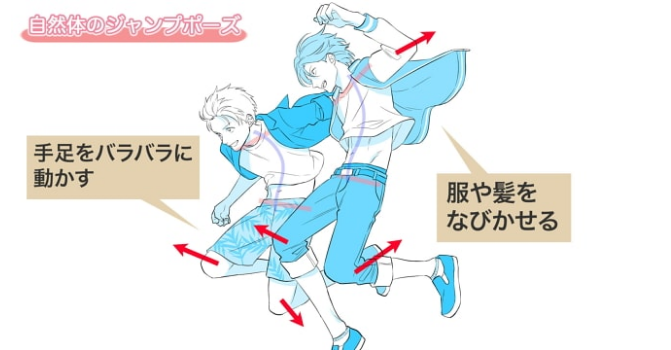 画法的要点是肘部和膝盖向外侧,手足无措地乱七八糟地移动就是这样。另外,使服装、发型等零件飘扬绘制时,您可以更容易地表达受风压的感觉,并更加强调动态感。