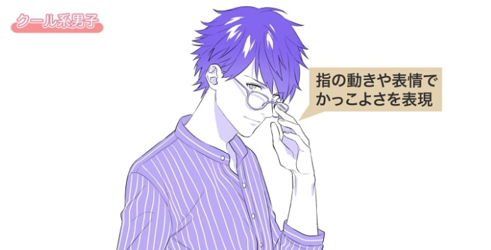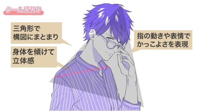 通过将冷酷无畏的表情、眼镜这一道具、以及戴眼镜的纤细手指动作这3个描绘在相近的地方,把注意力集中在你想要看到的点上,,可以让他们保持团结来表现出来。