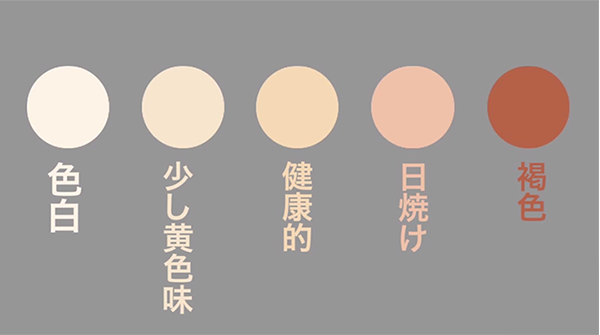 从左边开始,有五种类型:“白皙肤色”、“比白皙肤色略黄的肤色”、“中性健康肤色”、“晒黑的肤色”和“棕色的肤色”。