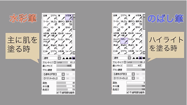 我主要使用水彩笔“绘制皮肤”和“绘制高光时”的扩展笔刷。