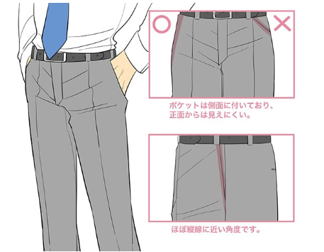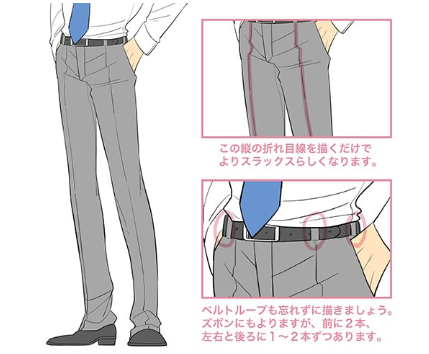 松弛点是前后中心的垂直线。只要画这个,它就会看起来像休闲裤,所以不要忘记它。