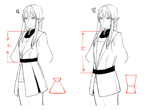 特别是背影中,根据腰带位置强调的女性臀部线条和男性背脊线条比正面更显眼,所以要注意衣服设计上的男女差别。