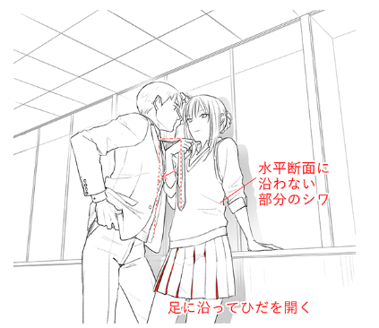 墙边的人物是靠着的姿势,所以把手放在某个地方的姿势是很自然的。衣服的下摆从身体的水平断面偏离的情况下,哪里会有很大的皱纹膨胀。