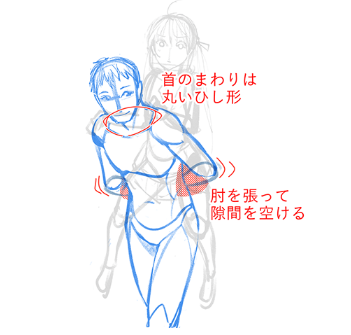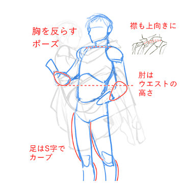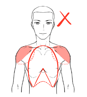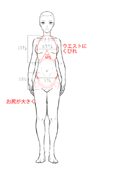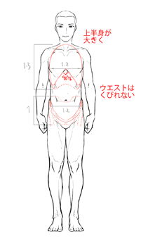 如果只画肩膀宽的话,腋下经常会产生不自然的间隙,不能很好地描绘胸部和手臂的连接部分。另外,由于腰到下比肩宽过细,身高越高平衡越差。要注意了。