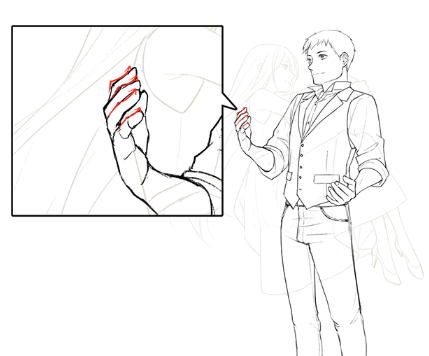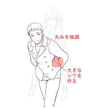 在线条画中,为了表现前倾姿势,牢牢地画出领子和袖子的圆角。