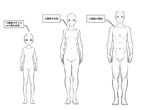 让我们比较一下六头身的孩子或者身材矮小的女性,比较真实的高个子女性,稍微苗条、身材高大的男性的体型吧。