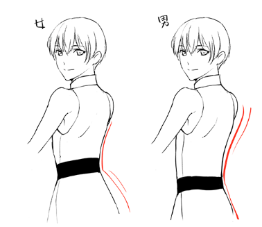 如果是男性化的角色,要强调背部隆起和没有收缩的腰围,相反,如果是女性角色的话,就用腰部的收缩和宽阔的臀部等来强调吧。