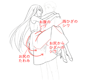 穿裙子的时候,在几个地方会产生皱纹和弯曲。因为被支撑膝盖背面的手拉着,所以从臀部到膝盖会有隐约的皱纹。