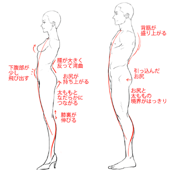即使像这样摆出同样的姿势,腰的弯曲方式也会出现很大的男女差异。