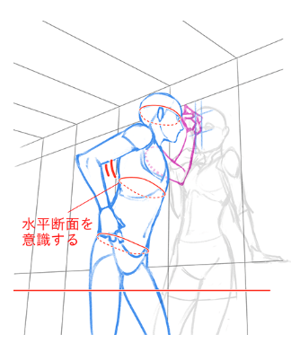 另外,像这幅画一样从较低的位置仰望的构图时,要注意角色的水平断面和眼睛鼻子的角度。裤子的腰带和衣服的下摆等,基本上都是沿着这条线的形状。
