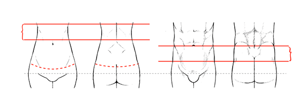 男性把下腹部、腰~臀部都画得平平点。