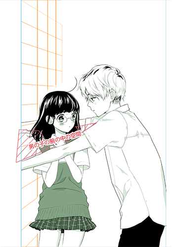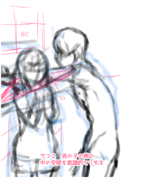 画法的诀窍是先画好墙面再加上人。因为是逼到墙边的姿势,所以如果意识到用斜线围起来的男孩手臂中的空间,像把女孩放在那里一样画出来的话,就会毫无违和感地呈现出气氛。