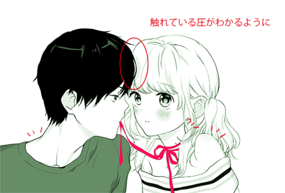 在手脚的动作中加入对方的反应和影响的部分。相互接触的部分、靠着的部分等,感觉自己是这个姿势,加深了意识所要去的地方的描写。