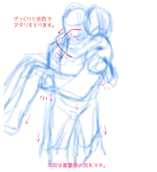 首先,粗略地取浅蓝色的草稿。如前所述,请考虑将施加重量感的位置。箭头的方向是重量的流动。