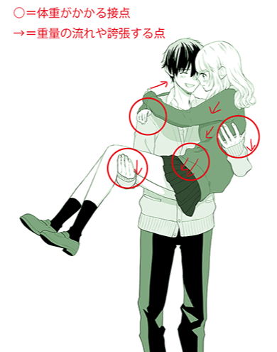如果是这个姿势的话,因为0记号的接点上有体重,所以用用力的手、被拉着的衣服等来表现重量感。