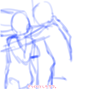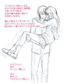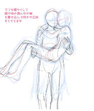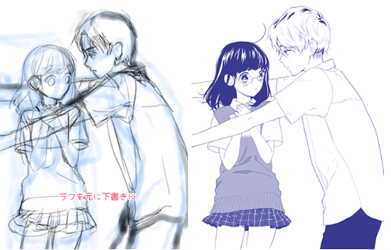 那么,在实际画两个人的姿势时,一边夹杂着想要注意的注意点,一边说明到草图为止的两种画法。