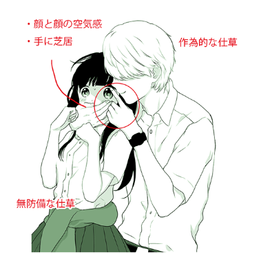 男孩子的作为举止和女孩子戴上毫无防备的动作,两个人的脸都几乎没有出现的作画,所以要在手上演戏。因为用手拉着女孩子,所以很重要地描绘了脸和脸相近的空气感。