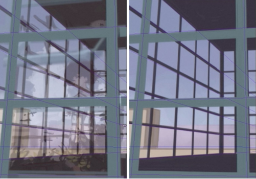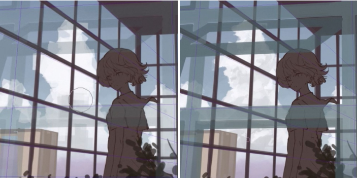 此外,将明亮的颜色放在覆盖层中的明暗边界、植物等上,以突出对比度和光的反射。