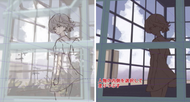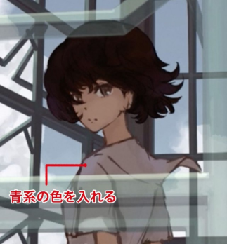 后面会进行详细的描绘,在明确光和影的对比度的同时,在阴影部分加入作为来自外部的环境光的蓝色系的颜色。