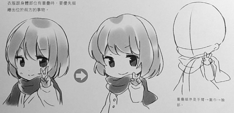 衣服跟身体部位有重叠时,要优先描绘出位于前方的事物.