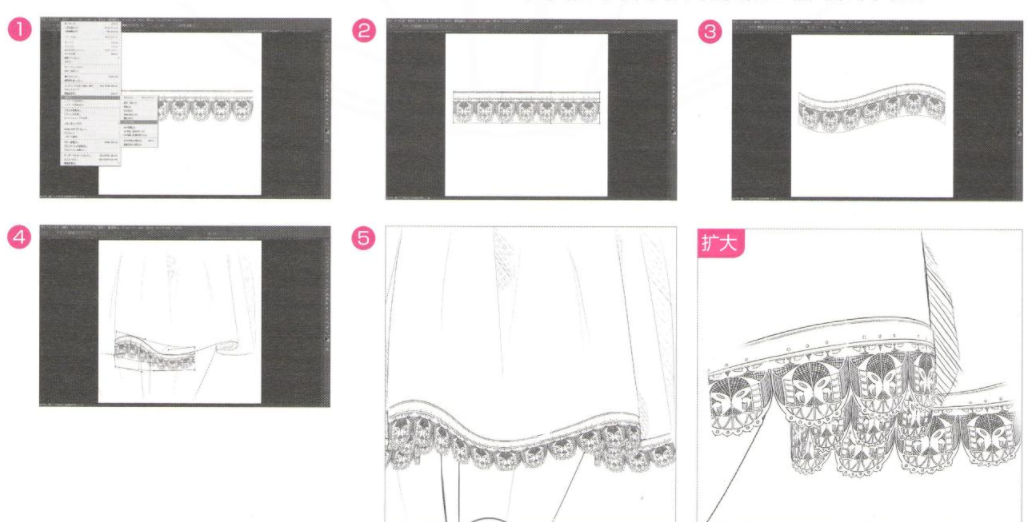这次用Photoshop来进行加工的部分。~将用复制粘贴排成一条直线的蕾丝边整理好,做成一条完整的蕾丝边。在编辑菜单中选择"变换”→"变形”,,图片中会显示出框架和操纵点,拖拽操纵点的话就可以让蕾丝边呈波浪式变形。~这一步需要根据对象的形状来做调整,蕾丝有重合的部分需要将多余的线条给删除。蕾丝的远近变化可以用缩小宽度和压缩图案来实现。