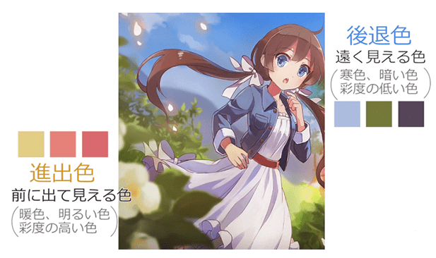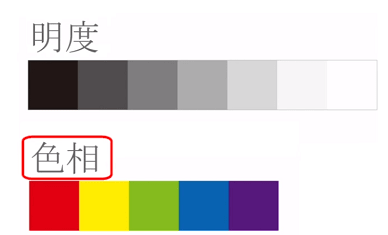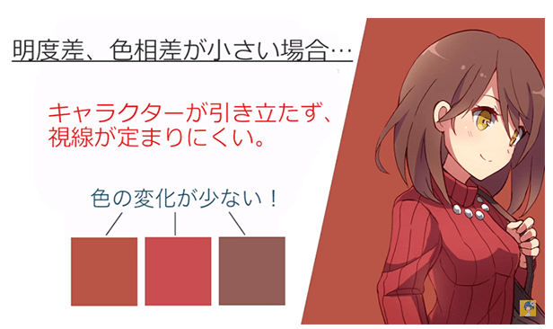 为了不使背景和角色同化,是作为颜色亮度程度的亮度和红色、黄色、绿色、蓝色、紫色这样的色调。色调(色相)添加差异是很重要的。