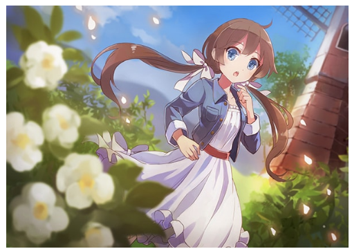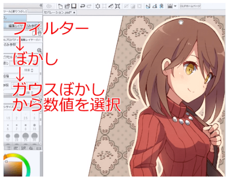在插图整体清晰的彩色的情况下,即使原封不动也没有问题,但是在厚涂等浮起的情况下,配合作品的气氛模糊(模糊)把它放在背景上。