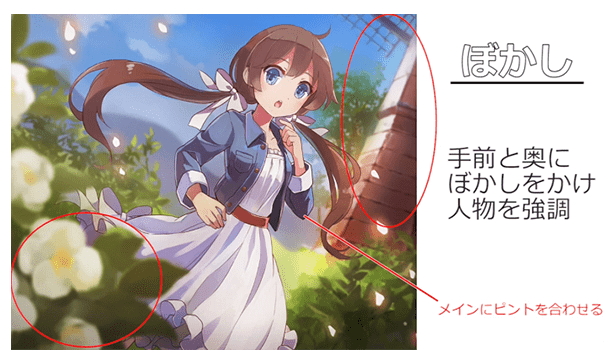 像这样,通过利用远近感进行模糊,可以将视线固定在想要吸引很多吸引人的地方,可以更好地衬托出人物的角色。
