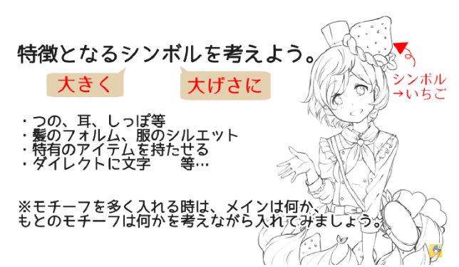 具体的东西有两个,耳朵,尾巴等,头发的形状,衣服的剪影,特有的物品,更直接的文字。