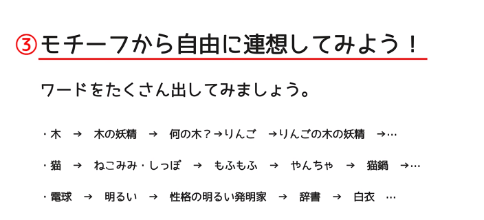 例如,从“树”到“树的妖精”。想想是什么样的树就是“苹果”。搭配起来会给人一种“苹果树妖精”的印象。