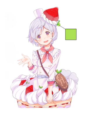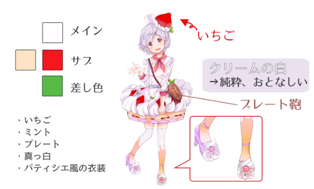那么,根据实际的事例,用以蛋糕为主题的角色进行说明。首先是图案的颜色,主要是奶油的白色,作为面料的淡黄色,草莓的红色。颜色是薄荷的绿色。