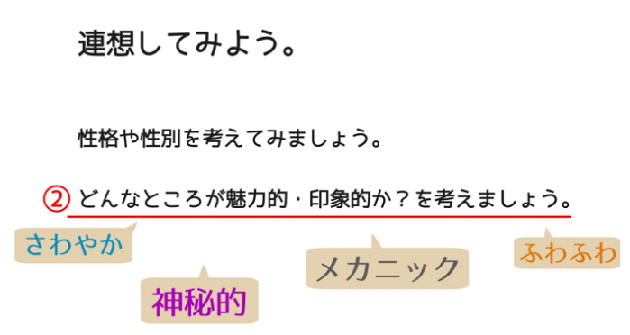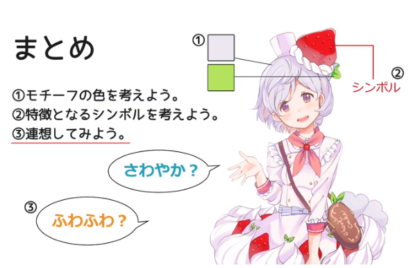 第一个是“考虑主题的颜色”,第二个是“考虑作为特征的象征”,第三个是“联想”三点。