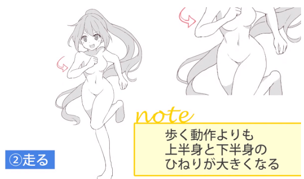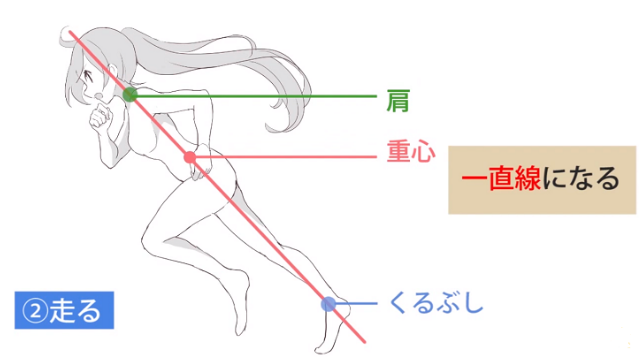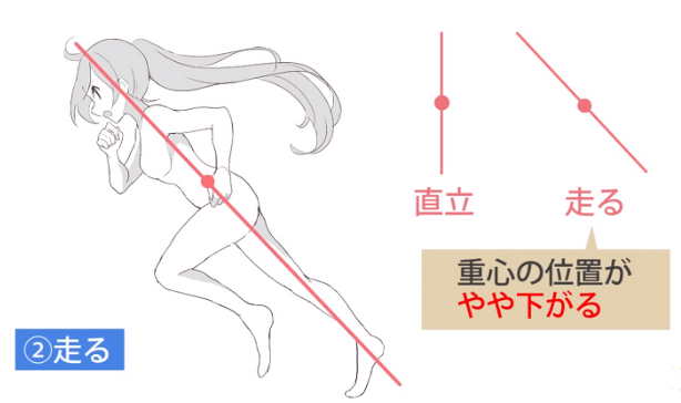 画跑步姿势时,身体的中轴显着倾斜,重心放在较低的位置。