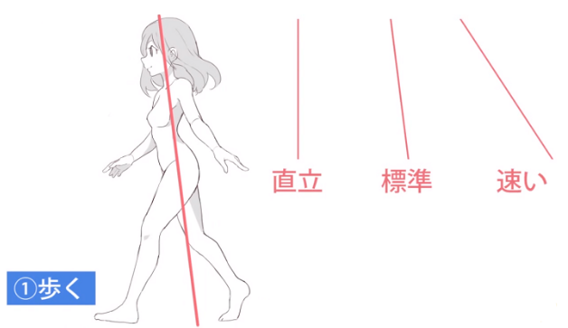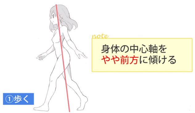 画行走姿势时,将身体的中轴稍微向前倾斜。
