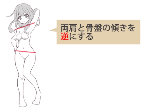 通过扭转双肩和骨盆的倾斜,有意打破左右平衡,在插图中添加了运动。