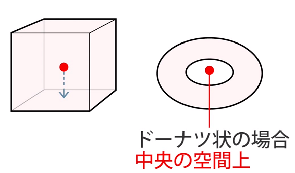 在右侧所示的甜甜圈形物体的情况下,重心存在于圆心的空间中。