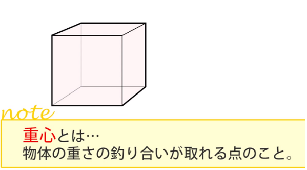 例如,立方体的重心位于物体的中心,在下图中的红点处,重力从该点向下作用。