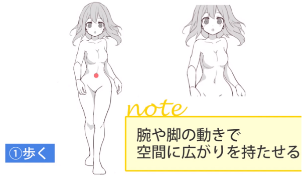 另外,画上比行走动作大的上身和下身的扭动,将台阶腿对面的肩膀往前画。