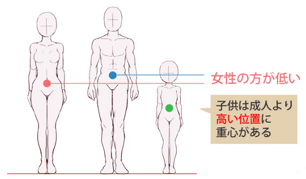 在直立姿势下,由于骨盆形状的不同,女性的重心略低于男性,儿童的重心高于成人。