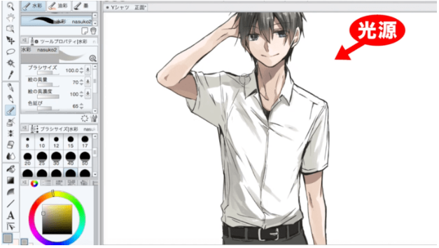 首先,按照右上角设定的光源和线条画的向导,大致地投下阴影。