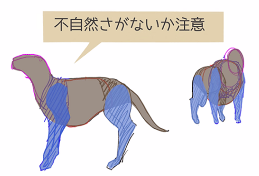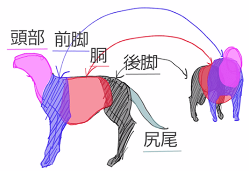 同时,从头部到尾巴的身体的中心部位有前腿和后腿的印象看的时候,确认一下是不是不自然就好了。