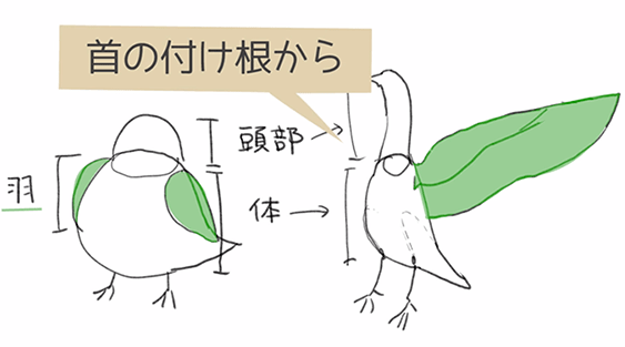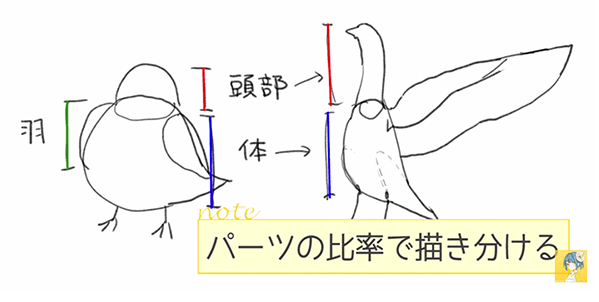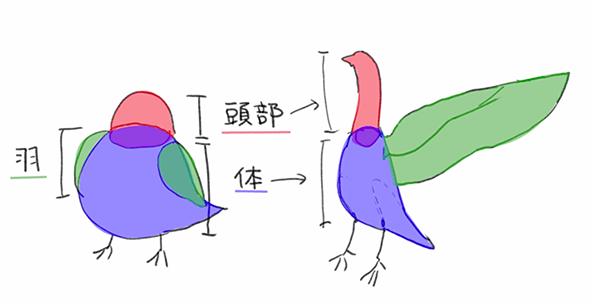 有像麻雀一样的圆圆的鸟和像鹤一样的细长的鸟等各种各样的体型,基本上可以通过改变3个部分的比例来分开描绘。