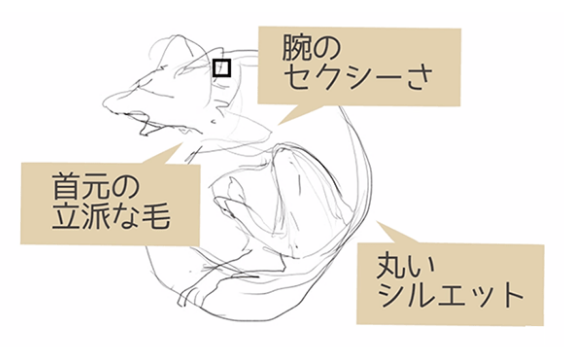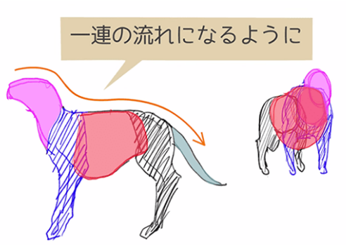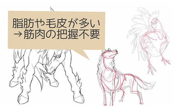 配合想画的生物画肌肉。另外,“根据需要”也有脂肪率高的动物和厚厚的毛皮动物等,即使不掌握肌肉也能形成形状的动物。