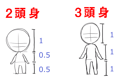 添加迷你人物形状的平衡请参考此图。两只头身作为描绘的要点,如:头:躯干:脚的比率为1:0.5:0.5,三头身.如果是这样的话,头:躯干:要意识到脚的比率是1:1:1。