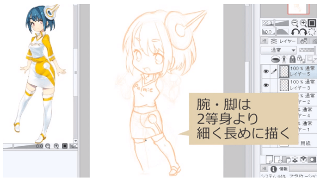 手臂和脚比2头身体画得细、长,平衡就会变好。