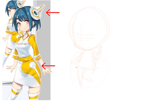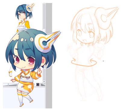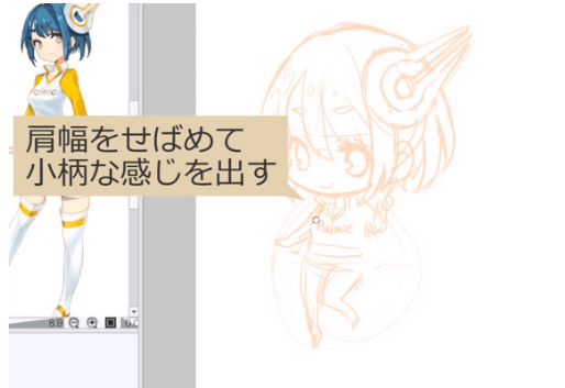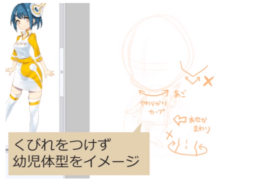另外,介绍一下想要意识到每个身体零件的变形的诀窍。特别是在2头身的情况下,意识到像婴儿一样的体型会显得很可爱。