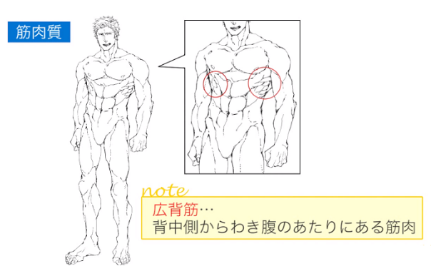肋骨的线条,浮起画出来。另外,腹肌用平缓的曲线画吧。