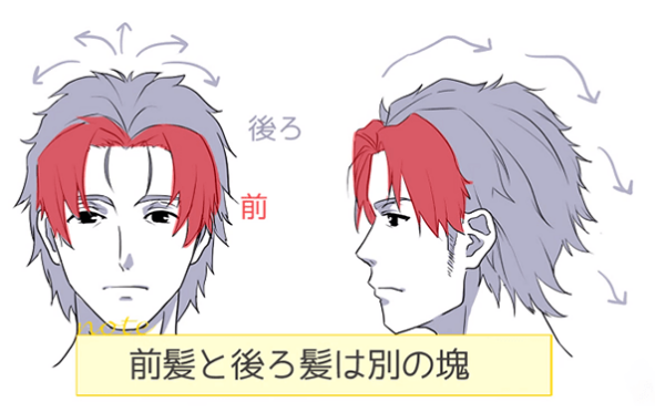 像这样抬高刘海的发型的情况下,把刘海和后面的头发作为不同的块来考虑。