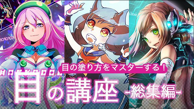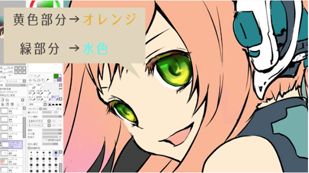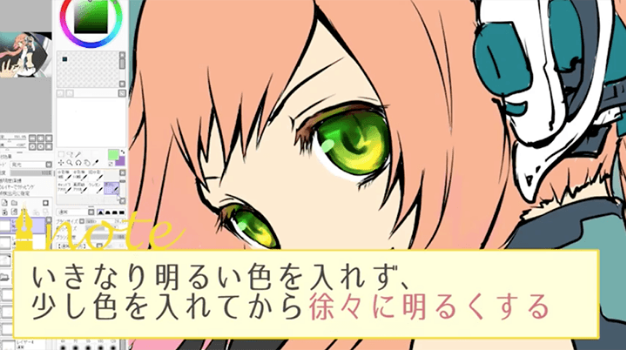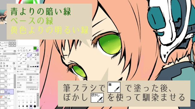 从瞳孔上方的部分开始依次着色,使色调为比蓝色更暗的绿色、基础的绿色、稍微色调比黄色更亮的绿色渐变。