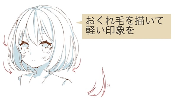 在画头发的时候,不要把一根头发画得密密麻麻的,而是画上“蓬松的头发”等,试着意识到蓬松轻盈的印象吧。